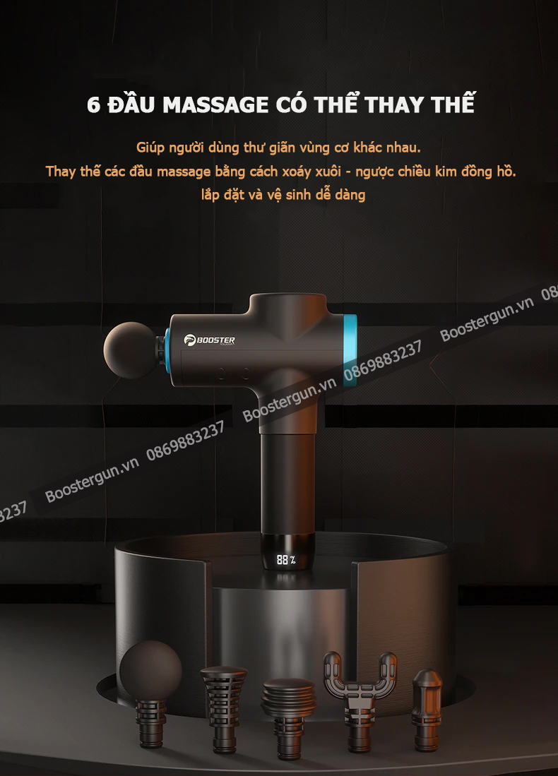 Máy massage cầm tay Booster M2 được trang bị 6 đầu massage khác nhau, đáp ứng nhu cầu massage ở các vị trí khác nhau trên cơ thể.