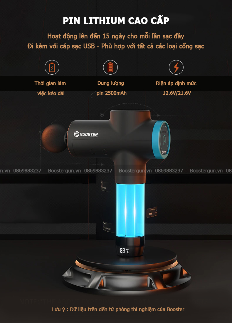 Máy massage cầm tay Booster M2 sử dụng pin lithium chất lượng cao có dung lượng 2500mAh  cung cấp nguồn năng lượng dồi dào và cho thời gian sử dụng lâu dài 2-3 giờ.