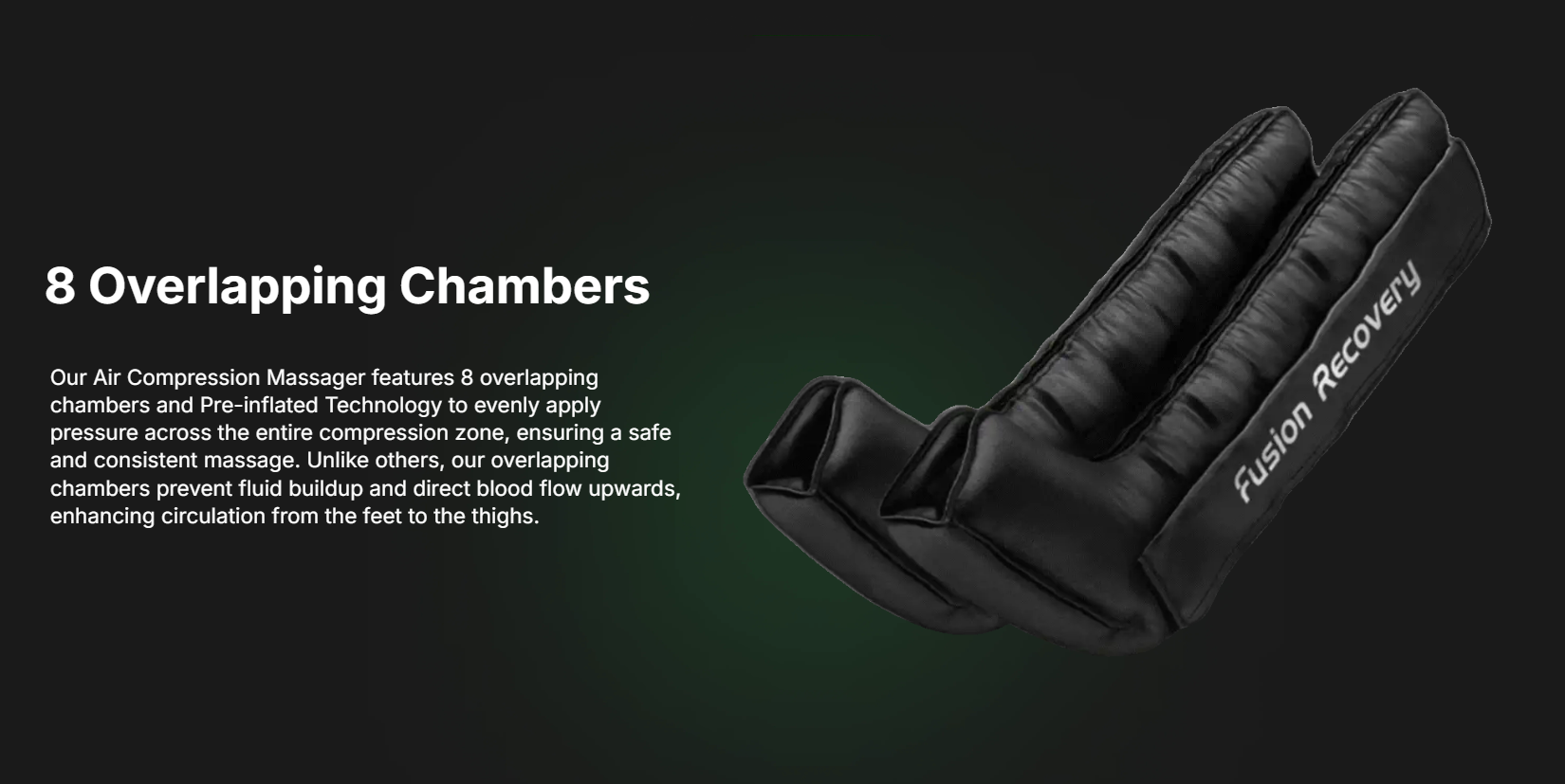 Thiết bị sử dụng công nghệ Fusion Recovery với 8 túi khí (chia đều từ cổ chân đến đùi trên), đảm nhận như một bác sĩ chuyên về thả lỏng cơ cho các VĐV chuyên nghiệp sau khi tập luyện cường độ cao mau chóng hồi phục lại nhanh để có thể tập luyện tiếp trong thời gian sớm nhất.